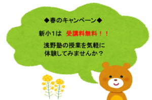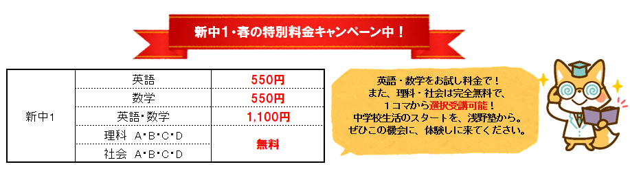 英語・数学をお試し料金で♪(各550円) 理科・社会は完全無料♪1コマから選択受講可能です。中学校生活のスタートを浅野塾から。ぜひこの機会に、体験しに来てください。
