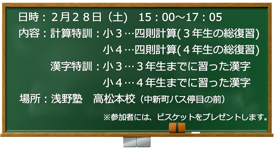 年長対象の第1回附小合格判定テスト を実施いたします。 香川大学教育学部附属小学校合格に向けての第1歩。まず、試験に慣れましょう。 実施要項 ◆ 日  時:Aクラス 5月28日(水) 午後 3:30~ 5:15   Bクラス 5月31日(土) 午後 1:00~ 2:45  Cクラス 5月31日(土) 午後 3:15~ 5:00  ◆ 会  場:浅野塾 高松本校 ◆ 定  員:各クラス12名ずつ ◆ 受 験 料:5,060円 ◆ 出題内容:知能・創作・体育・音楽・集団行動 ( 詳細は別紙をご覧ください。)  ★当日、お持ちいただくもの  鉛筆(2B程度) 、はさみ、 12色程度の色鉛筆(クーピーペンシル)、 ※動きやすい服装で来てください。 ◆ 結  果:答案用紙は、集計処理した上で個人成績表を添えて、6/11(火)以降に返却 いたします。       ・ 個別面談をご希望される場合は、テスト結果を踏まえて30分程度実施いたします。 ※ 個別面談の日程は、後日お渡しします用紙にてご希望をお伺いしてから、調整をし決定いたします。       ・ 個別面談をご希望されない場合は、郵送等にて結果をご返却いたします。 #浅野塾  #浅野塾高松本校 #附属高松小学校受験  #小学校受験 #幼児クラス  #年長 #高松市  #学習塾 #模擬テスト